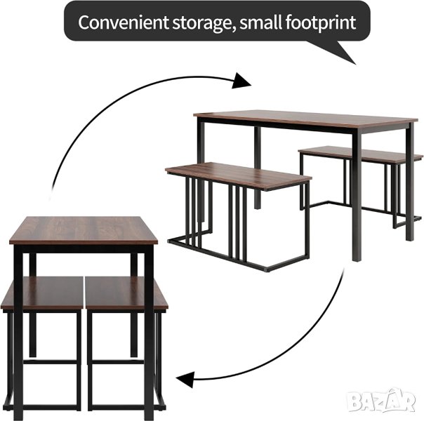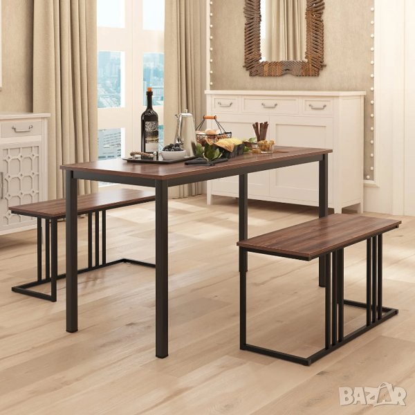 Металната рамка на масата и пейките са прахово боядисани Този комплект включва: 1 х 140 см маса за хранене с голям плот и 2