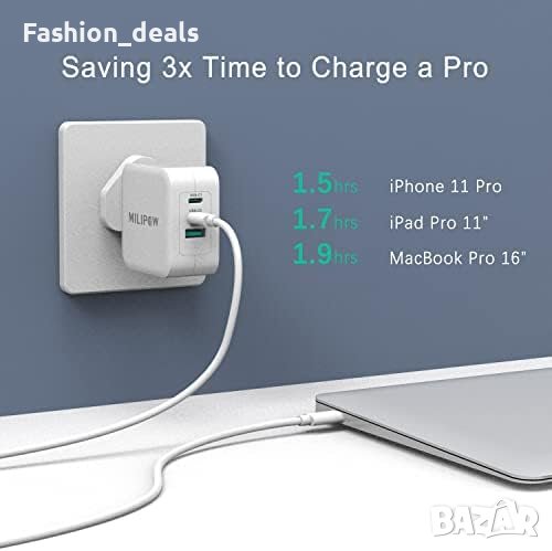 Комплектът включва: 1 x MiliPow 100W Type C Charger (White), 1 x 1.8m USB-C към USB-C кабел за зареждане.