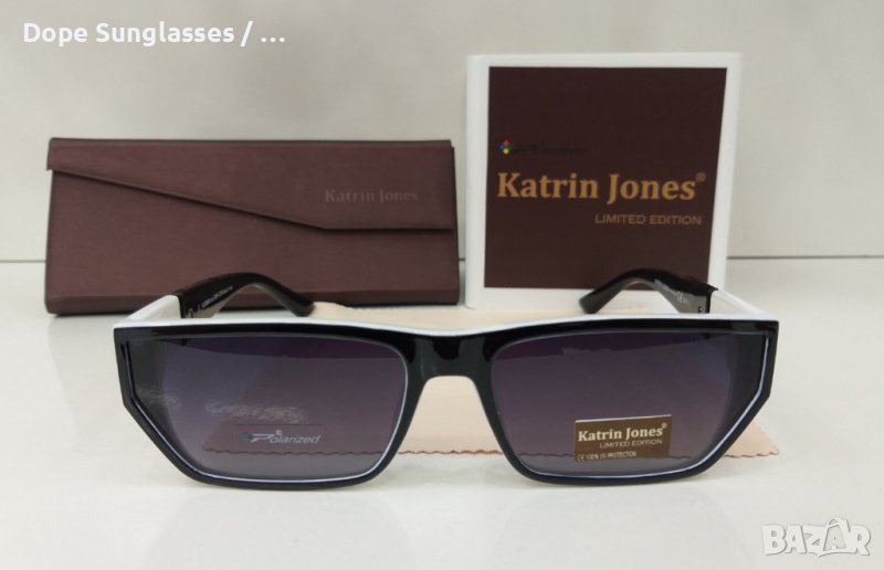 Katrin Jones е запазена марка слънчеви очила произвеждани от висококачествени материали. Рамката им се произвежда от ацетатна пластмаса с която се изработват предимно очила от скъпите брандове като Dior, Gucci, Armani или метал с допълнително обработен с не съдържащ никел материал, който предпазва от корозия вследствие изпотяване и не предизвиква алергии. Плаката също е с силно покритие което осигурява пълна защита от вредните UVA и UVB спектри на светлината. Допълнително се поставя и филтър на POLAROID който пък спира тези лъчи от отразената светлина (не само от пряката), така се постига пълен ефект при защитата на очите. Много важно условие при лещите са свойствата " Яркост " и "Контраст". В предложените от нас очила, са съчетани всички необходими качества за да отговарят на условията за "Лукс" - скъпа рамка , пълна двойна защита осигурена от многослойна плака с дебелина 1.5мм. (което е идеален показател), и не на последно място, висока прозрачност без никакви отклонения в картината. Лещите на тези очила са произведени от специален висококачествен полимерен материал който се използва при преминалите марки.