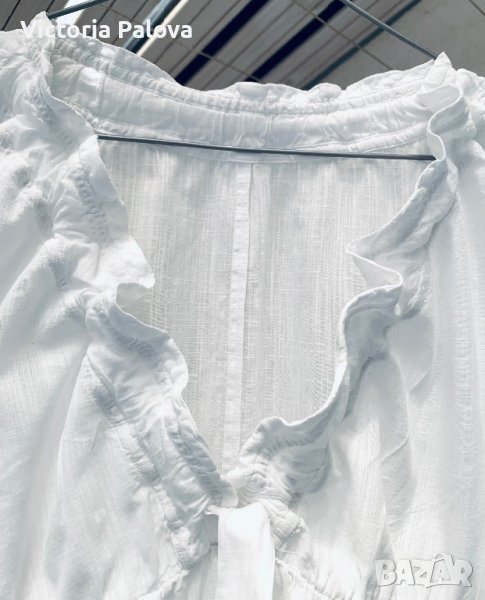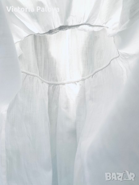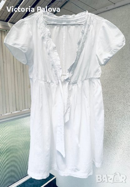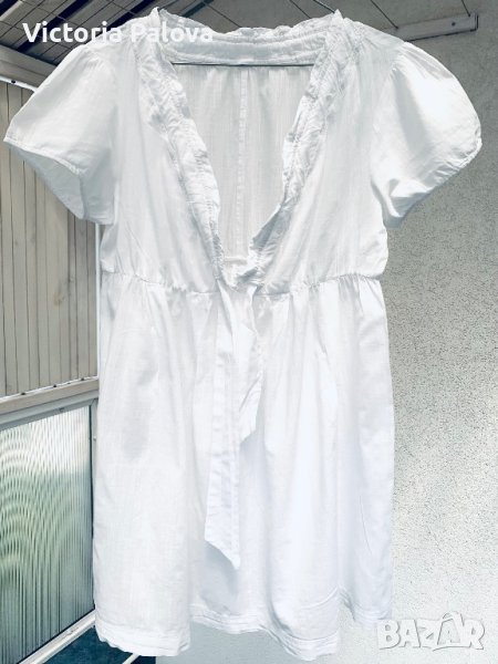 Много красива туника, подходяща и за плаж - прекрасен тънък въздушен памук, интересно деколте с възможност за различни варианти за връзване, нежни ластици по ръкава и талията. Туниката е неизползвана. Рамо - 44см, дължина - 83см, талия - 42 см до 50см.