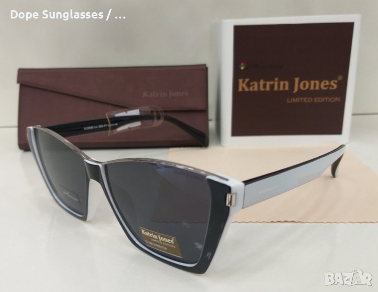 Katrin Jones е запазена марка слънчеви очила произвеждани от висококачествени материали. Рамката им се произвежда от ацетатна пластмаса с която се изработват предимно очила от скъпите брандове като Dior, Gucci, Armani или метал с допълнително обработен с не съдържащ никел материал, който предпазва от корозия вследствие изпотяване и не предизвиква алергии. Плаката също е с силно покритие което осигурява пълна защита от вредните UVA и UVB спектри на светлината. Допълнително се поставя и филтър на POLAROID който пък спира тези лъчи от отразената светлина (не само от пряката), така се постига пълен ефект при защитата на очите. Много важно условие при лещите са свойствата " Яркост " и "Контраст". В предложените от нас очила, са съчетани всички необходими качества за да отговарят на условията за "Лукс" - скъпа рамка , пълна двойна защита осигурена от многослойна плака с дебелина 1.5мм. (което е идеален показател), и не на последно място, висока прозрачност без никакви отклонения в картината. Лещите на тези очила са произведени от специален висококачествен полимерен материал който се използва при преминалите марки.