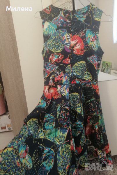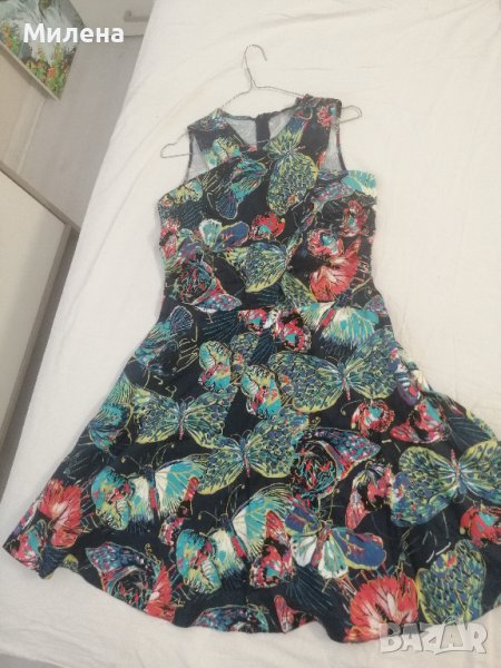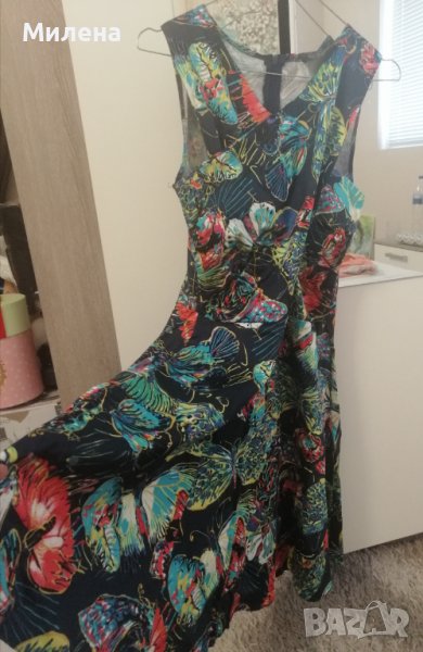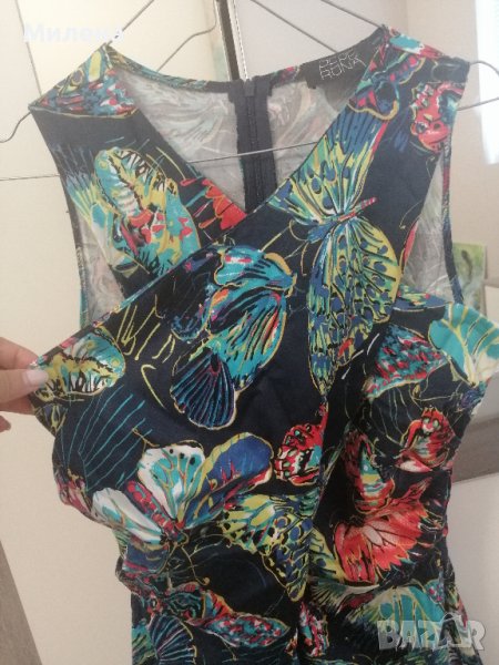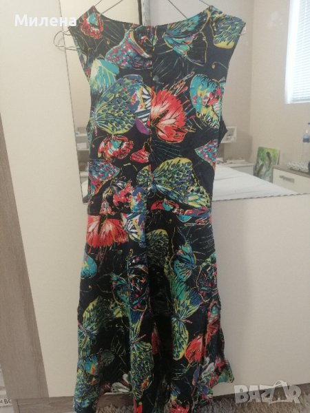 Свежа рокля с интересна предна част, разкроена от талията надолу. Чудесна кройка, стои много елегантно, но за съжаление ми е тясна и не съм я носила. Материята е памук/плат/, не прозира и почти не се мачка. Дължината е малко над коляното.