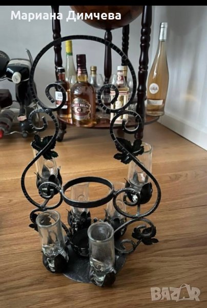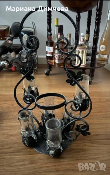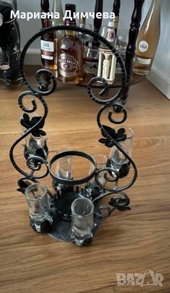 Антична ръчно изработена медна поставка за бутилка с орнаменти от гроздови листа и комплект от 6 чаши с изящна форма и изработка от най-високо качество стъкло.