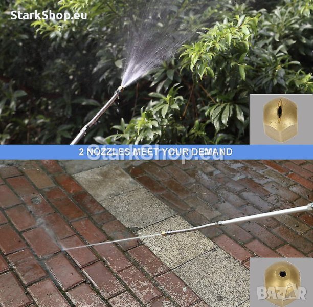 - Изработена е от алуминий и неръждаема стомана, което й придава изключителна здравина и издръжливост. Пръскачката в края си има два вида дюзи, за широки и тесни дюзи, както и връзка за маркуч в другия край.