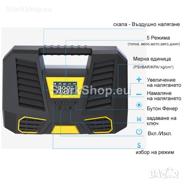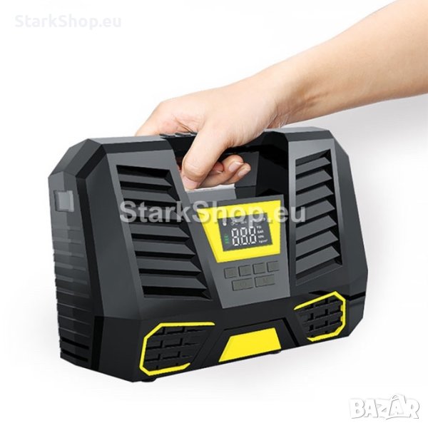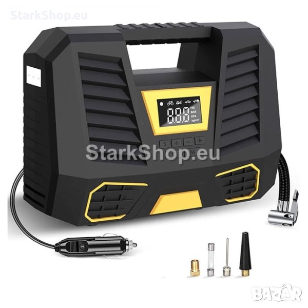 Мощен, професионален дигитален компресор за гуми с фенер за кола и различни накрайници. Верен помощник на всеки автомобилен фен. Включени накрайници за напомпване и на велосипеди, надуваеми уреди, топки и др.