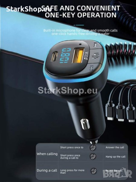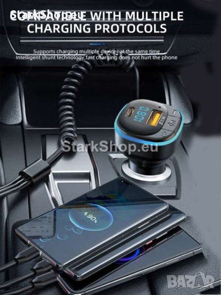ФМ Трансмитер с бързо зарядно и кабели за кола – Type-C, MicroUSB и Lightning – iPhone. Подходящ за слушане на музика и провеждане на разговори с включено бързо зареждащо зарядно с три броя кабели за зареждане на няколко устройства едновременно.