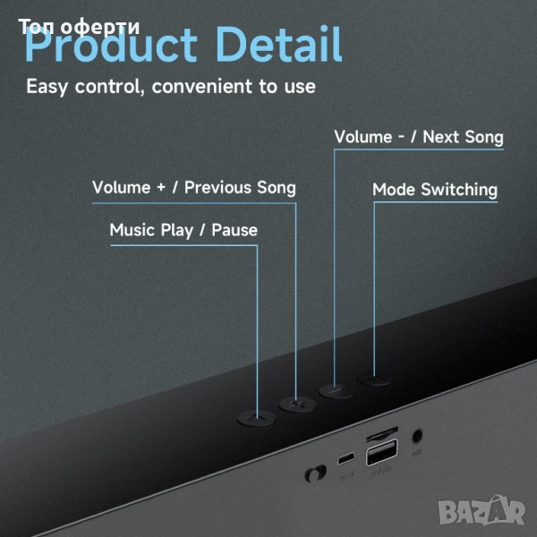 Удобство на една ръка разстояние: Специално проектиран с мисъл за използваемостта, този саундбар приема независим дизайн на бутоните. Бутоните са удобно разположени в горната част на звуковата лента за лесен достъп и безпроблемно управление.