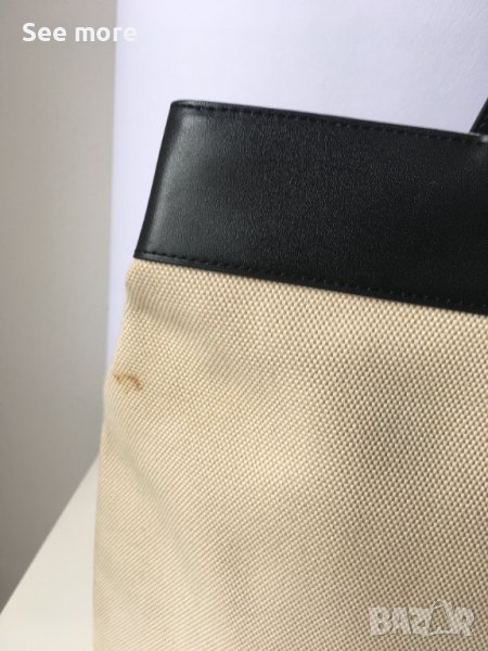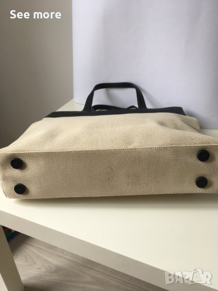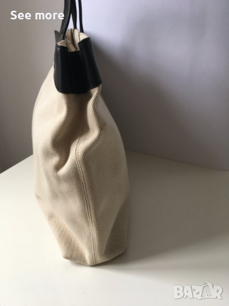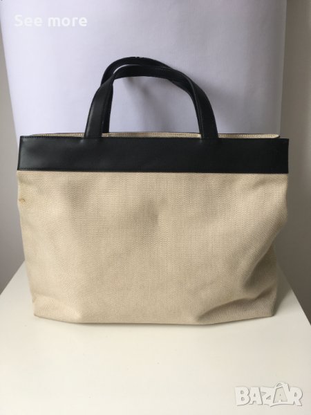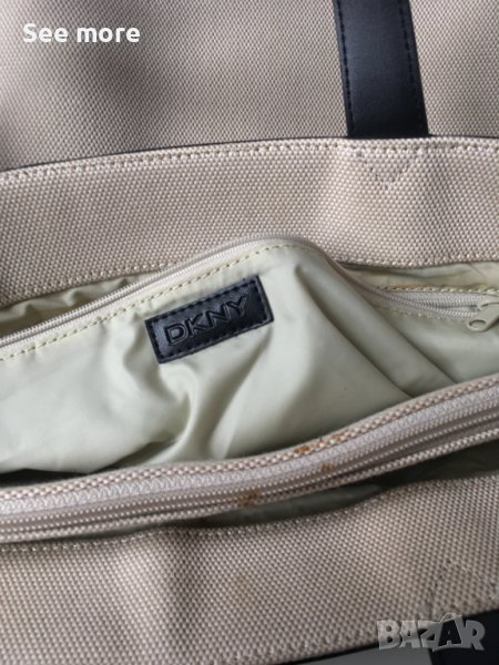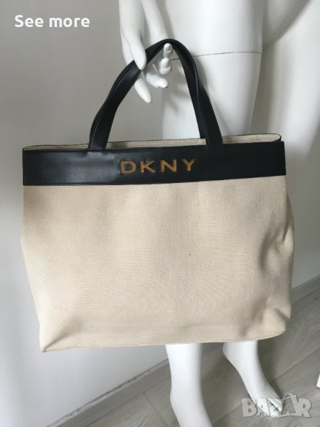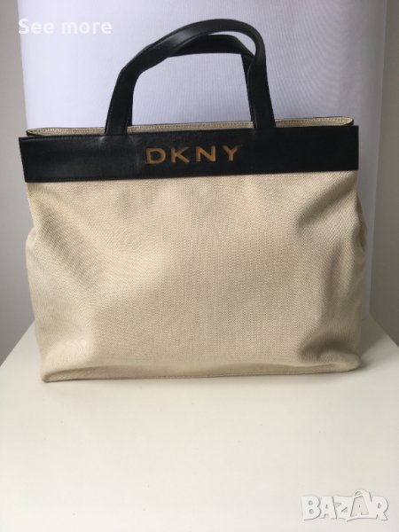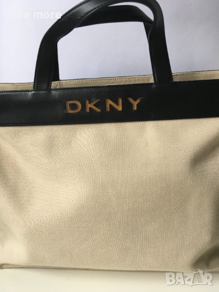 DKNY оригинална елегантна чанта! Комбинация естествена кожа и плат! Има няколка петънца показани на снимките! Има нужда от почистване! Нищо сериозно и поправимо! Височина 33 см,ширина 47 см,дъно 9.5 см,височина на дръжките 12.5 см! Изпращам по Еконт и Спиди!