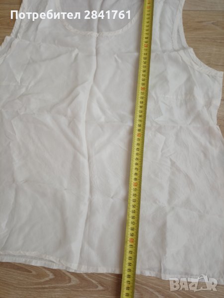 Блуза без ръкав, потник в цвят кремаво и бяло. Размери L-XL. Кремавият е със съдържание 35% коприна, 65% вискоза. Белият е от тънка коприна. В добро състояние - само пробвани, без да са носени. Единична цена 10 лв. /бр., обща цена за двете 18 лв.