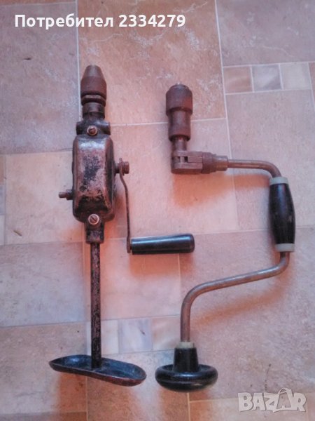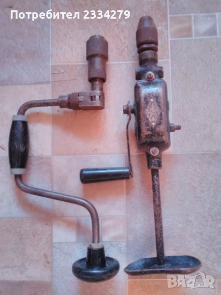 N:1 стари дърводелски свредла ръчно изработени от възрожденски майстор, дължина и дръжка 25х8см., цена 15лв. двете.; N:2 ръчна двелка, реверсирен маткап с цена 20лв.; N:3 Стара ръчна дрелка, маткап от 70-години, цена 20лв. Работещи може да се ползват или за декорация, колекция.