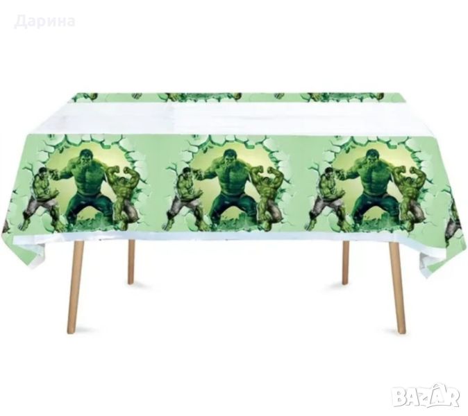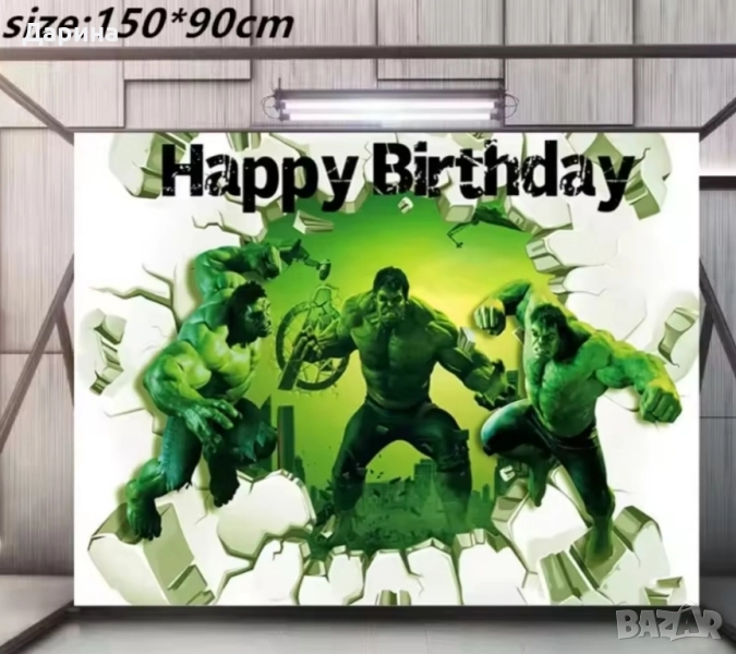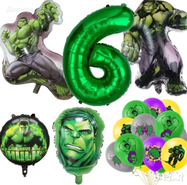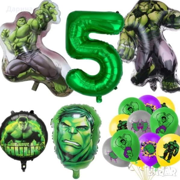Парти сет балони Хълк. Сета се състои от 17бр. балона : 1бр. Хълк 52/72см., 1бр. Хълк 60/62см., 1бр. лице Хълк 33/42см, 1бр. кръгъл балон с 2 лица 42см, 12бр. латексови балони 30см. и 1бр. цифра 80см от 2 до 7г. Покривка 108/180см - 9лв. /4.60€. Банер - 15лв./7.67€. Винил 150/90см. - 30лв./15.34€. Нови.