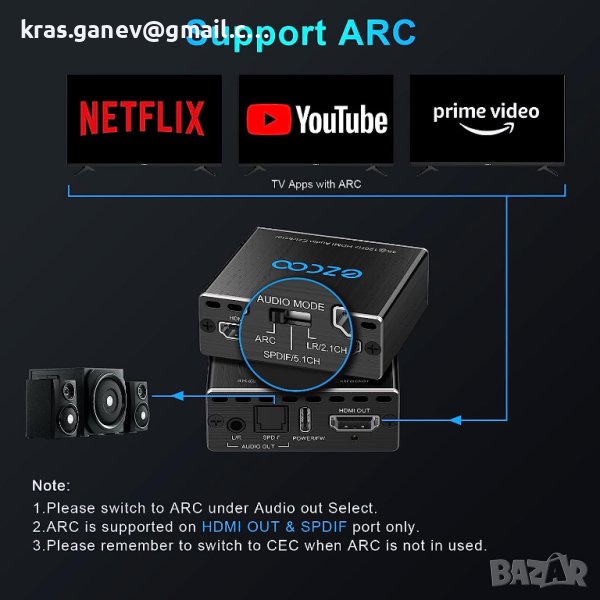 ✨【Лесно използване на HDMI EXTRACTOR ARC CEC EDID】 Поддръжка на ARC CEC EDID настройка. Свържете кабел тип C от USB 5V1A Просто свържете HDMI източник с входен порт и HDMI приемно устройство с изходен порт през 𝗛𝗗𝗠𝗜 𝟮.𝟭 𝗖𝗮𝗯𝗹𝗲 𝗹𝗲𝘀𝘀 𝘁𝗵𝗮𝗻 𝟯𝗠, AUDIO MODE SELECT ARC, Optical и L/R ще извеждат аудио от телевизионни приложения БЕЗ CEC. AUDIO MODE SELECT SPDIF/5.1CH, COPY TV'EDID, Аудиото ще бъде 5.1CH CEC. AUDIO MODE SELECT L/R/2.1CH,COPY TV' EDID,Audio ще бъде 2.1CH CEC