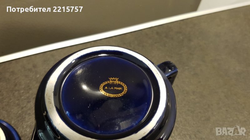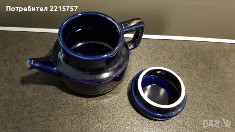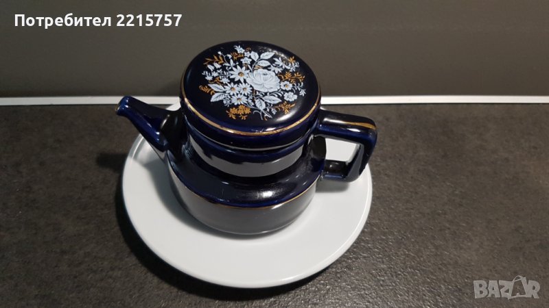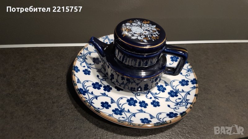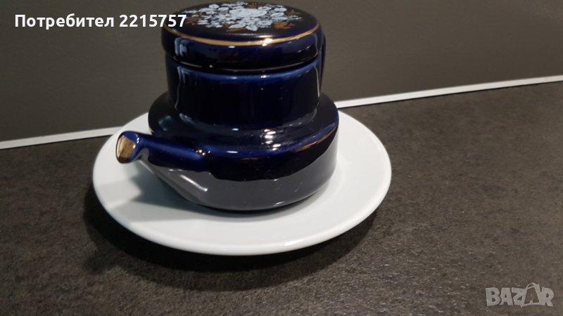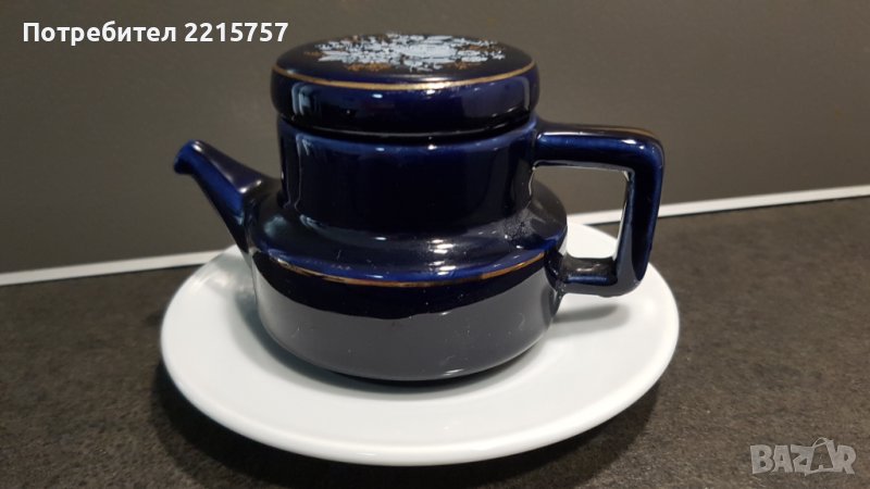 Миниатюрна каничка за декорация от Италия. Кобалт- тъмно-син със златен кант. Вис. 7см, шир. 8,5см. Има маркировка. Чинийка с тъм.сини цветя в подарък. Цена 30лв.