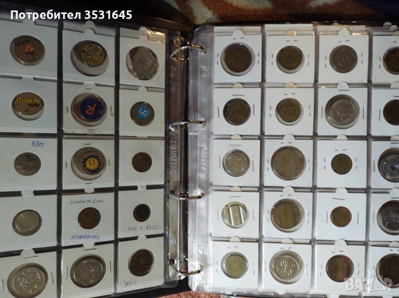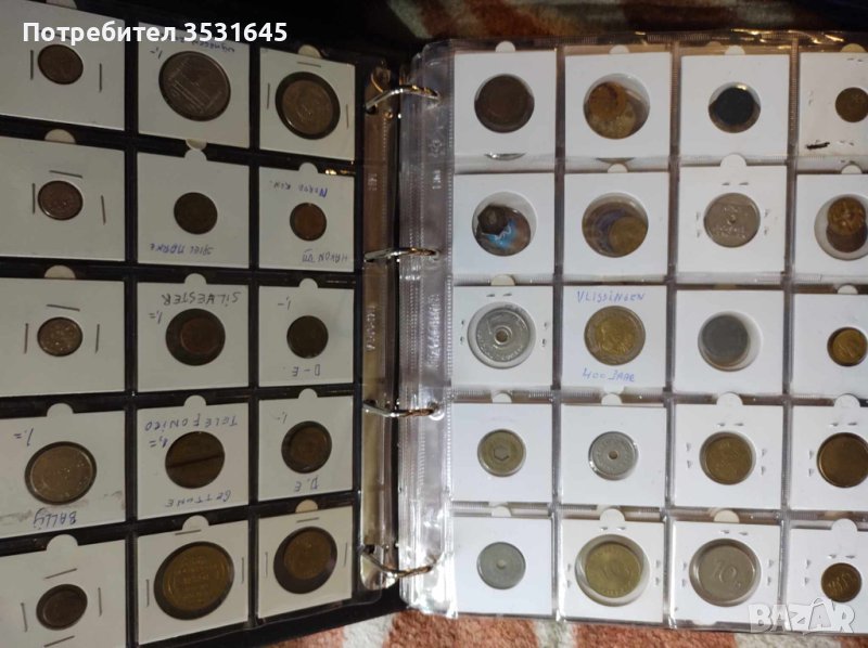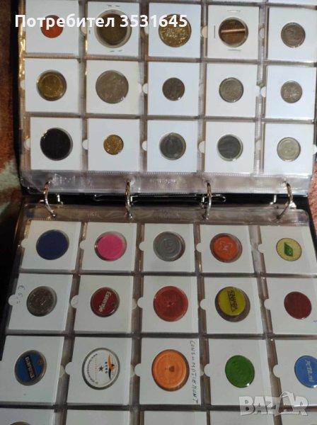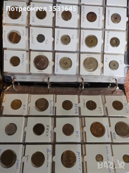 Много голяма колекция от токени събирани и купувани от цял свят грижливо опаковани в картончета и събрани в голям кожен класьор с дебели и твърди корици.