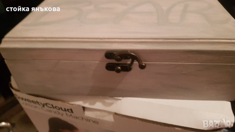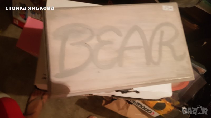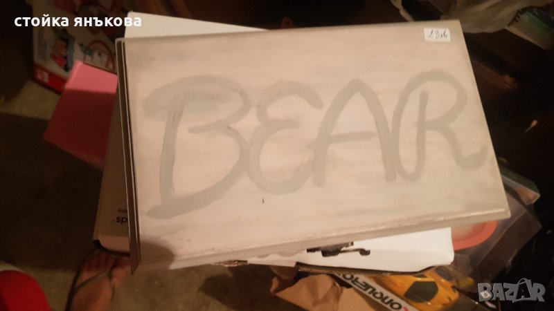 Продавам дървена винтидж кутия с преливащо сивосиньо на светла основа с надпис BEAR Мече. Приблизителни размери 18/25