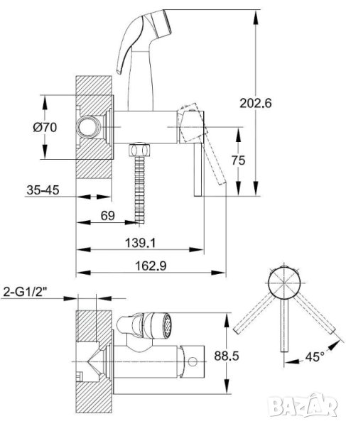 С държач за душ, метален маркуч и розетка със СТОП вентил