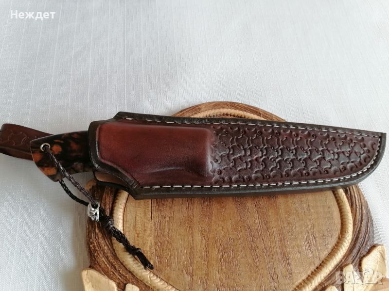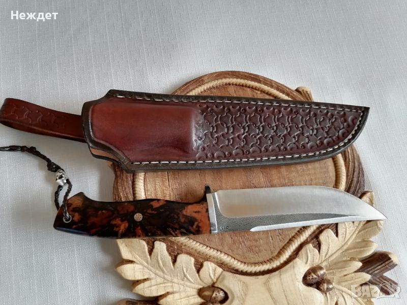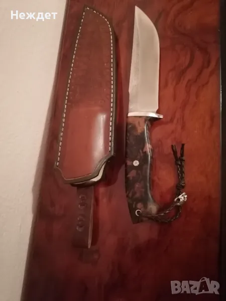 Нож от Слав Славов стомана Д2 закален на 61единици с крио. Размери на острието 155/34/4мм.Дръжка от стабилизиран Бук, мозаечен пин и кожена висулка изработена от мен. Има кожена кания от 3,5мм телешки бланк.