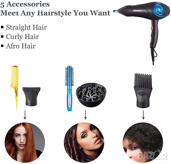 СЕШОАЛ С АКСЕСОАРИ: Дифузер за сешоар и син гребен за къдрава коса, концентратор на въздушния поток и жълт гребен за права коса, черен гребен за афро коса.