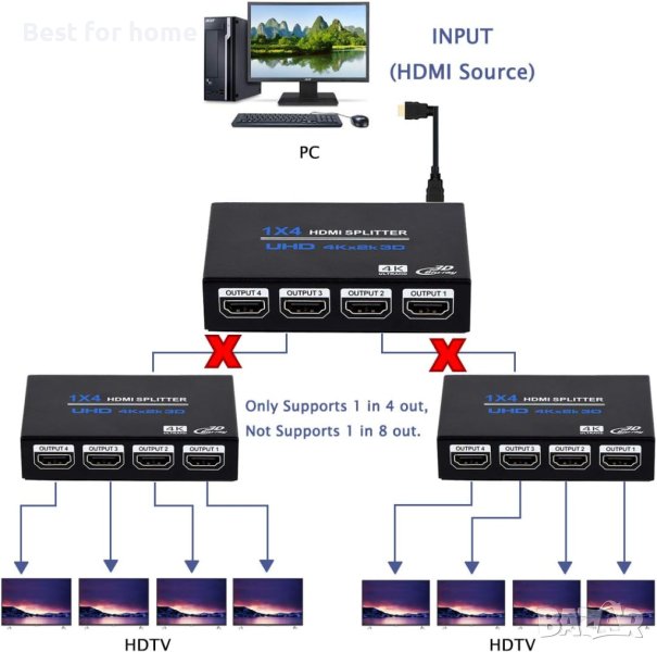 HDMI сплитер 1x4: HDMI сплитер 1x4 разпределя входните HDMI сигнали към 4 еднакви HDMI изхода едновременно. (ЗАБЕЛЕЖКА: Този 1x4 HDMI сплитер просто отразява/дублира екрана, не поддържа разширен режим, който показва различен екран, всеки екран ще показва една и съща страница. И също така, моля, имайте предвид, че това е 1 HDMI вход 4 HDMI изхода HDMI сплитер, а не 4 HDMI входа 1 HDMI изход HDMI Switch)