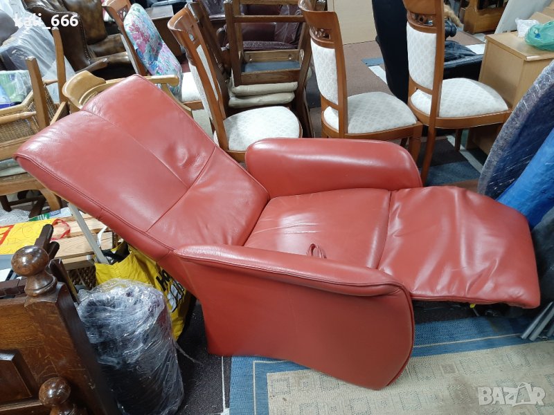 Комфортно релакс кресло, произведено в САЩ. Изработено от естествена кожа. Облегалката пада назад тип шезлонг и има приставка за краката. В много добро състояние. Закупено от Холандия.