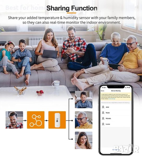 Можете да споделите температурния монитор със семейството си, за да наблюдавате температурата и влажността заедно