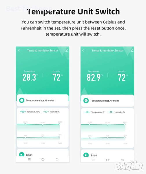 Можете да превключите температурната единица ℉/℃, да зададете предварително стойността на алармата и да получавате известия чрез приложението.