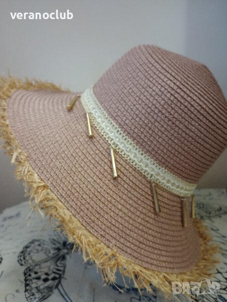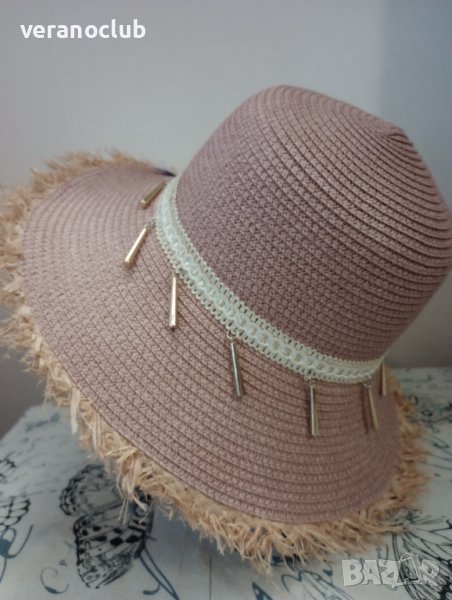Кокетна дамска лятна капела в уникален цвят от пастелната гама на лилавото, завършена с ефектен контур от натурална слама. Капелата е декорирана със златист ширит и малки златисти висулки. Периферията е средна. Размерът на шапката е подходящ за 56 см.