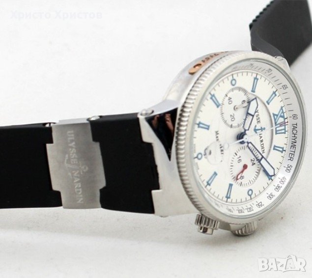Ulysse Nardin Maxi Marine, кварц, хронограф, полиран стоманен корпус L316, ефектен бял циферблат с дата в позиция 6 часа, фосфоресциращи стрелки, римски цифри и черна каучукова каишка.