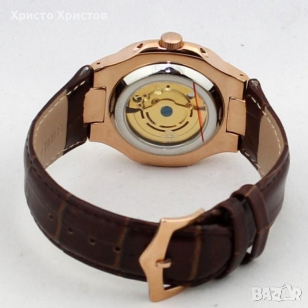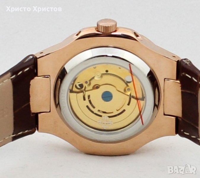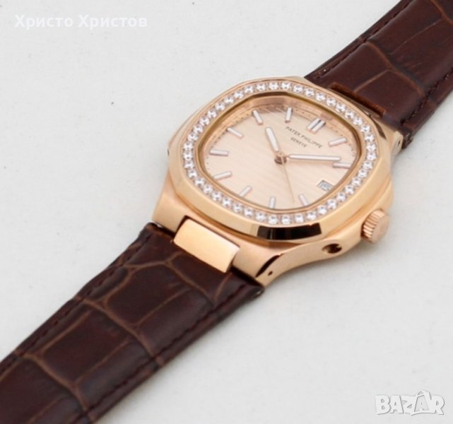 Patek Philippe Nautilus, механичен, автоматик, полиран стоманен корпус розово злато, ефектен златист циферблат с дата в позиция 3 часа, ринг с бели камъка, фосфоресциращи стрелки, маркери и кафява кожена каишка.