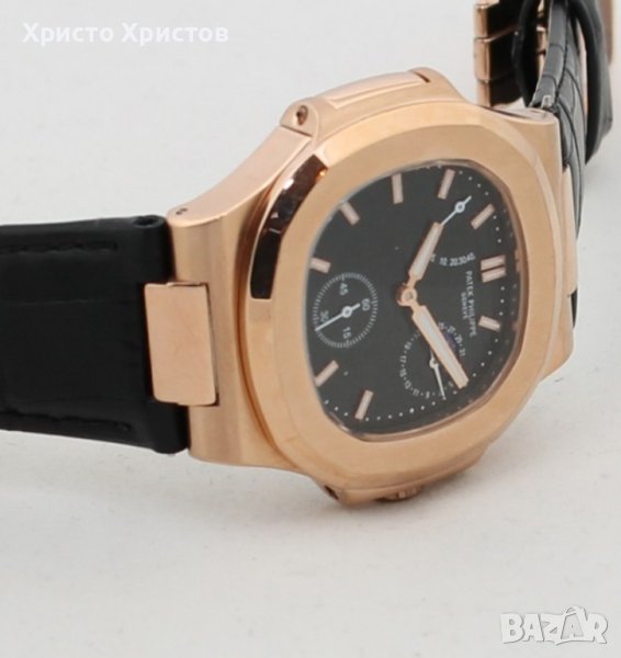 Patek Philippe Nautilus, механичен, автоматик, полиран стоманен корпус розово злато, ефектен релефен циферблат с дата, лунна фаза, пауър резерв, фосфоресциращи стрелки, маркери и черна кожена каишка с оригинално закопчаване.