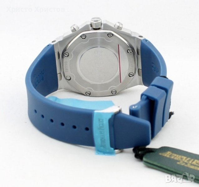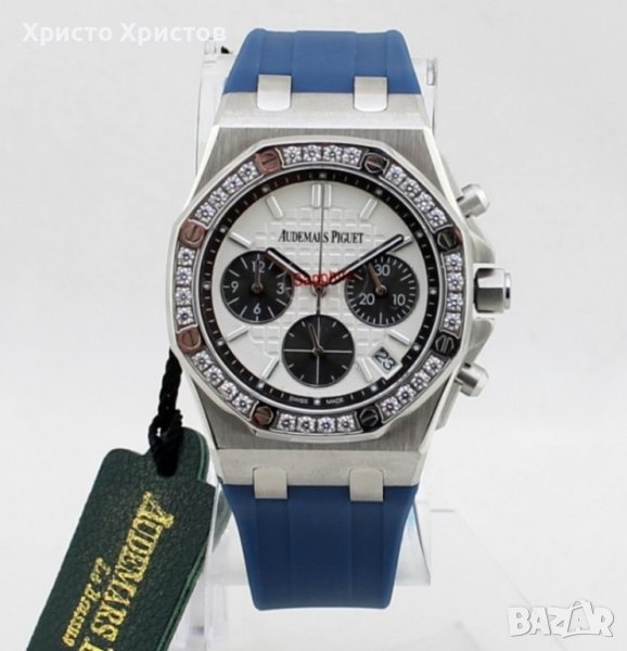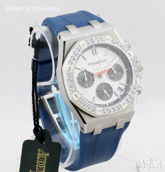 Луксозен ръчен часовник Audemars Piguet Royal Oak Offshore, кварц, хронограф, финно полиран стоманен корпус L316, ринг с камъни, ефектен бял циферблат с дата в позиция между 4 и 5 часа, фосфоресциращи стрелки, маркери и синя каучукова каишка с оригинално закопчаване.