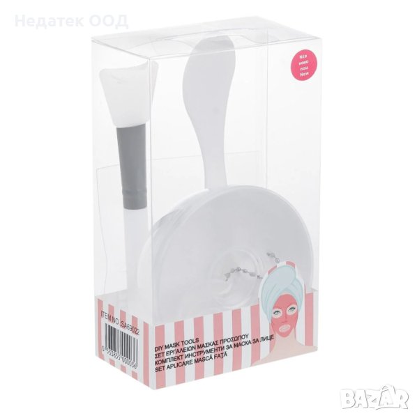 Опаковката съдържа смесителна купа с капак, комплект от 3 дозатора, силиконова четка и шпатула за приготвяне и нанасяне на маска за лице.