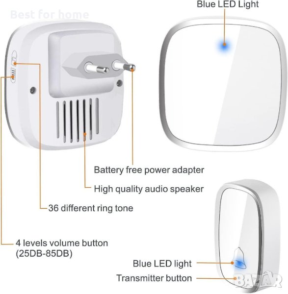 Дълъг обхват и силен сигнал: 280 м обхват на открити площи, сигналът може да проникне добре през препятствия, достатъчно дълго за повечето домове. Независимо дали готвите в кухнята или плевите в градината, този звънец ще ви държи в течение, така че никога да не пропуснете посетителя си. ЛЕСНО ИНСТАЛИРАНЕ: Просто включете приемника в електрически контакт и монтирайте бутона на стената или рамката на вратата. Синият светодиод мига, когато има посетител. Различни мелодии и сила на звука: Изберете от 36 различни мелодии, вариращи от класически до добре познати мелодии. Регулируема сила на звука от 25 dB до 85 dB. Устойчив на атмосферни влияния предавател: Водоустойчивият бутон IP44 е подходящ за употреба на открито.