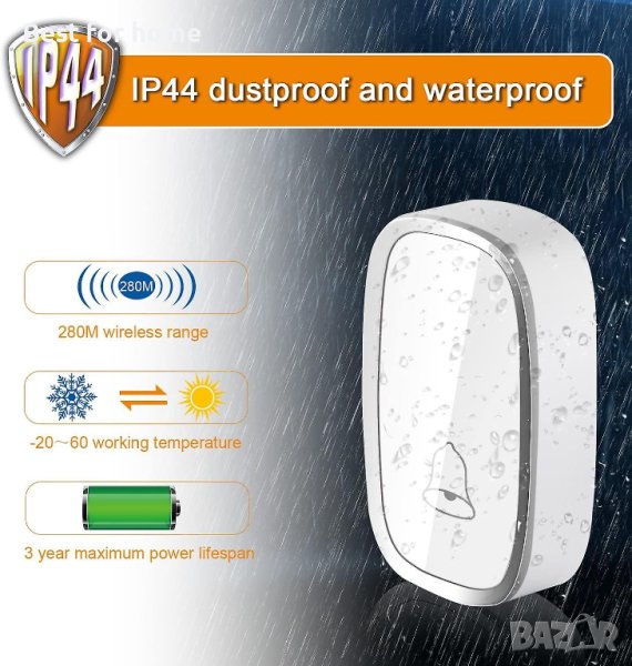 Безжичен звънец с обхват 280 м, 36 мелодии, 4 нива на звука
