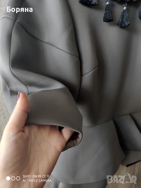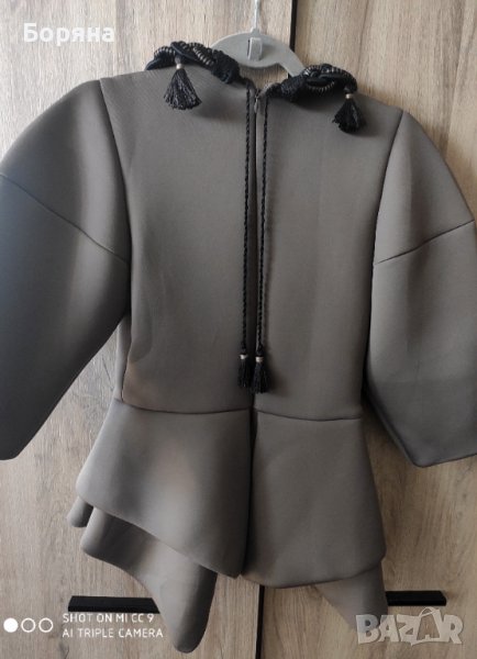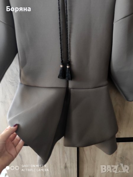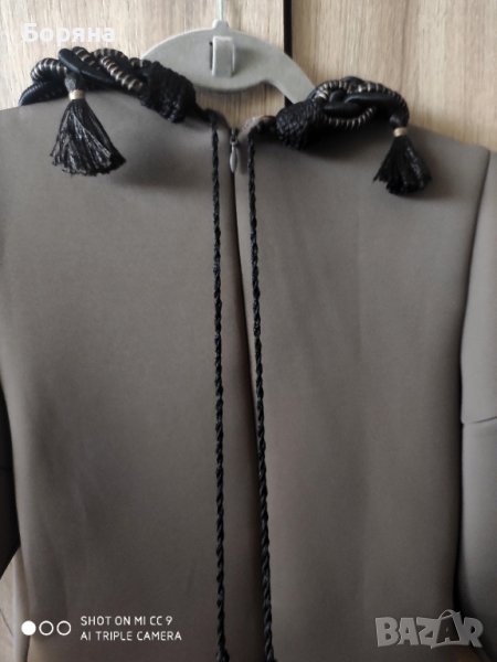 Цвят милитъри зелен, колието е вградено и не се сваля. С цип по цялата дължина на гърба, пеплум в талията.