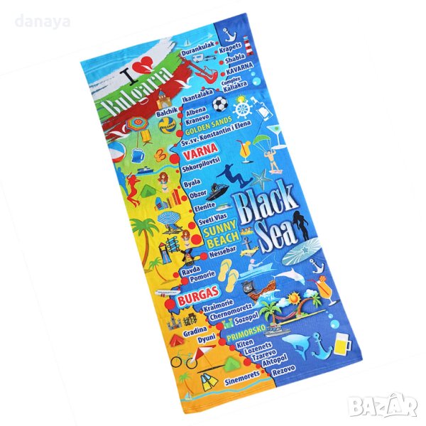 Плажна хавлия в свежи ярки цветове с принт на курортните селища на българското черноморие. Изработена е от качествен бързосъхнещ микрофибър. Плажната кърпа не задържа ситния пясък. Може да се пере в пералня до 40 градуса. Ултра лека и удобна при пътуване. Супер мека и приятна на допир. Размери 70х150см. Хавлия за плаж със супер свеж летен дизайн.