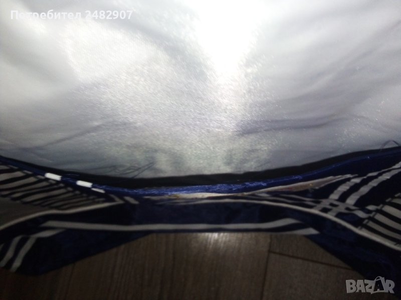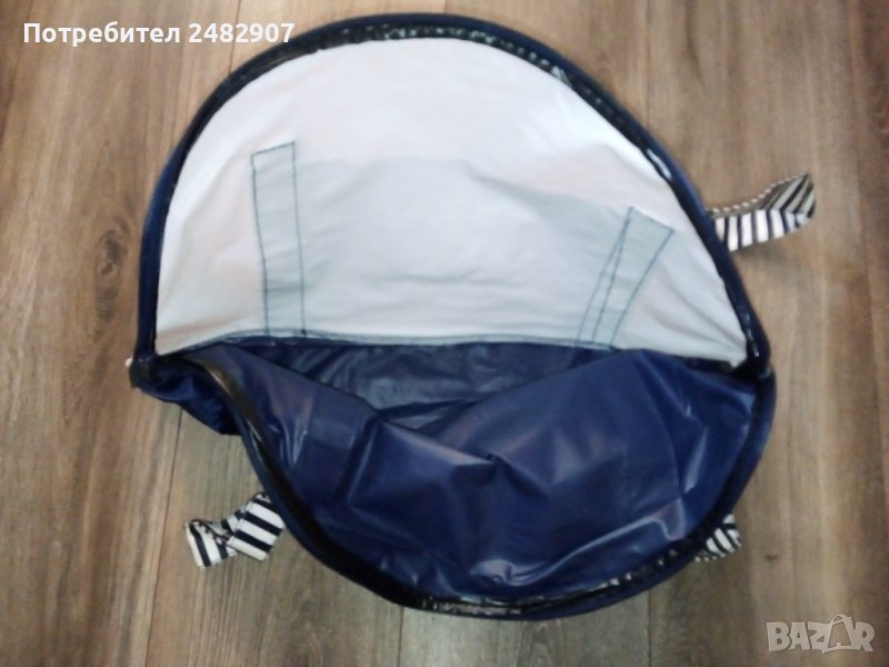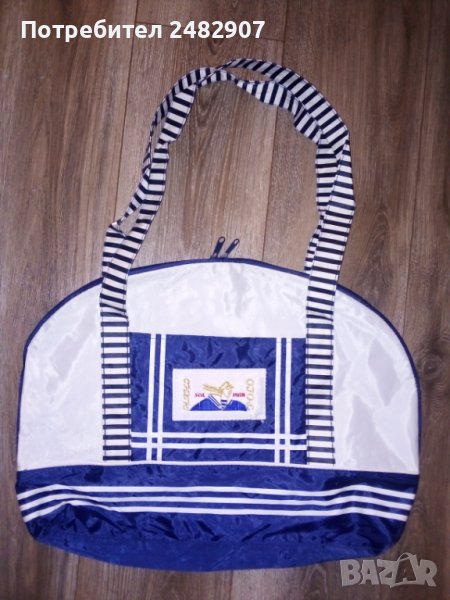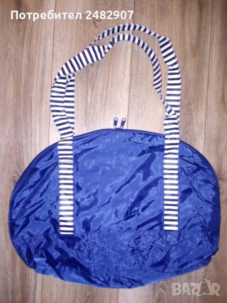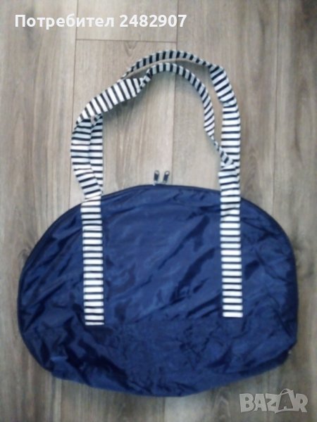 Голяма плажна чанта в тъмносиньо и бяло с морски акцент. Размери - 40/52 см, ширина на дъното - 9,5 см. Височина от дъното до горната част на дръжките - 69 см размери на външния джоб - 22/15,5 см. Много запазена и удобна, използвана е само веднъж, закопчава се с цип.