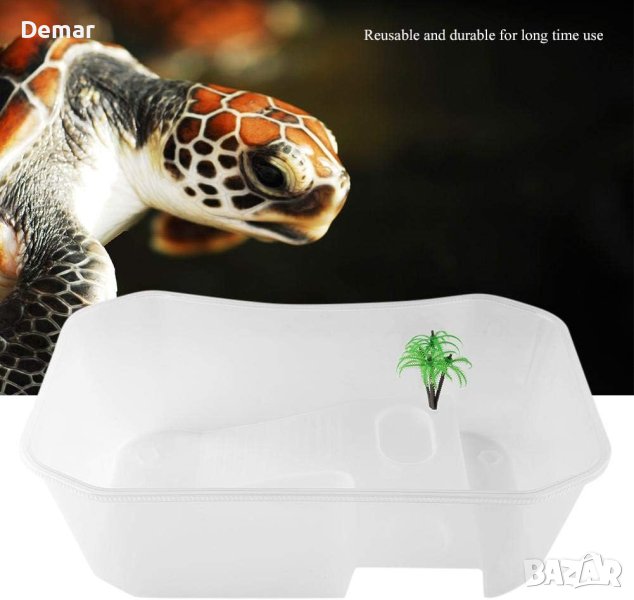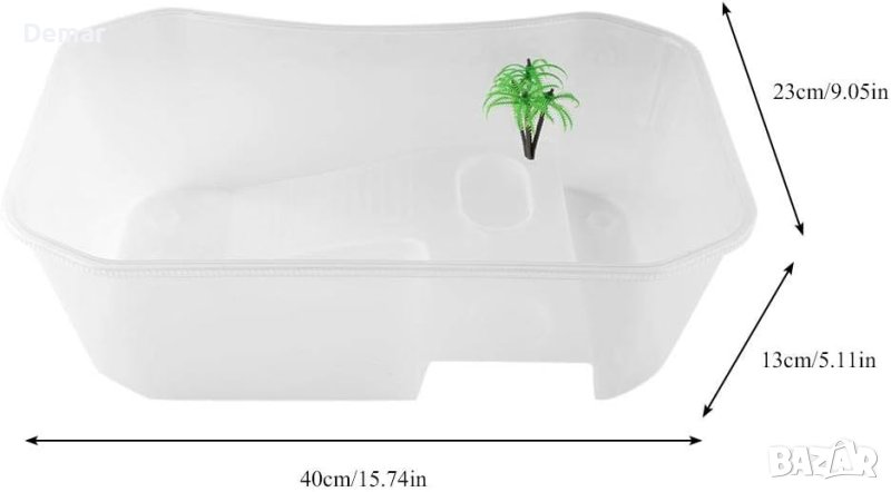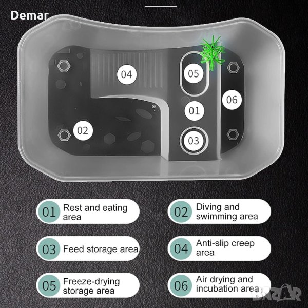Този дизайн на аквариума разполага с 5 отделни зони, включително нехлъзгаща зона за пълзене, платформа за греене, корито за хранене, зона за хибернация за размножаване и зона за плуване. Тези зони осигуряват по-здравословна и по-просторна среда за вашите домашни любимци, като същевременно предлагат нов начин за взаимодействие с тях. Резервоарът за рибки е изработен от безопасен и нетоксичен PP материал, осигуряващ издръжливост за дългосрочна употреба. Неговият малък размер и полупрозрачен дизайн го правят лек, преносим и лесен за носене, което ви позволява да се насладите на гледката на аквариума, като същевременно осигурява красив и практичен дом за костенурки, полуводни костенурки, раци отшелници, раци, риби и малки земноводни.