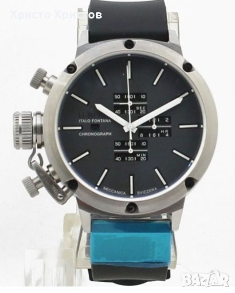 Луксозен ръчен часовник U-Boat Italo Fontana, кварц, хронограф, черен циферблат с дата в позиция 9 часа, фосфоресциращи стрелки, маркери, корпус от неръждаема стомана L316 и черна каучукова каишка с оригинално закопчаване. Удобен за носене на дясна ръка.