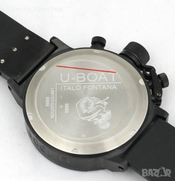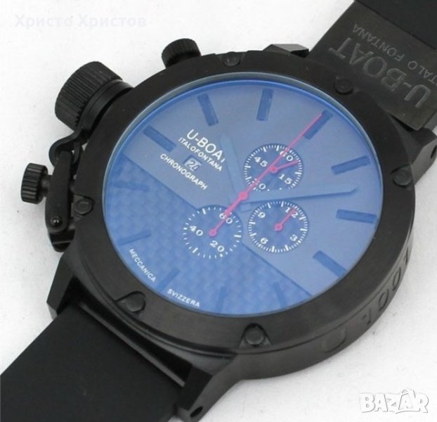 Луксозен ръчен часовник U-Boat Italo Fontana, кварц, хронограф, стоманен корпус с черно PVD покритие, тъмно сив циферблат с дата в позиция 9 часа, карбон, сиви и червени стрелки, маркери и стрелки и черна кожена каишка.