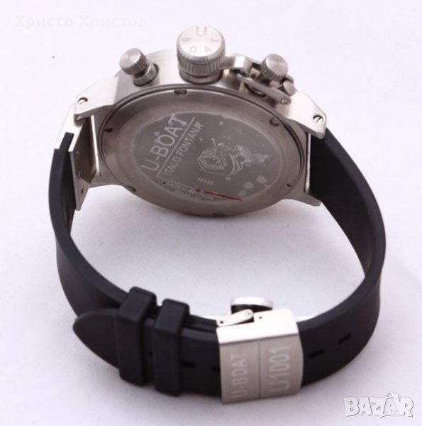 Ръчен часовник U-Boat Italo Fontana, кварц, хронограф, тъмно сив циферблат с дата в позиция 9 часа, корпус от неръждаема стомана и черна каучукова каишка с оригинално закопчаване. Удобен за носене на дясна ръка.