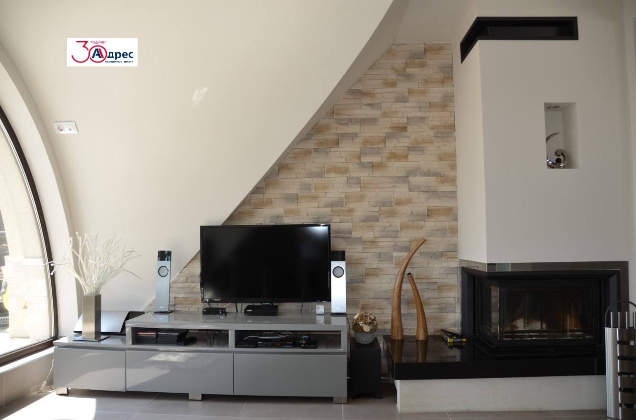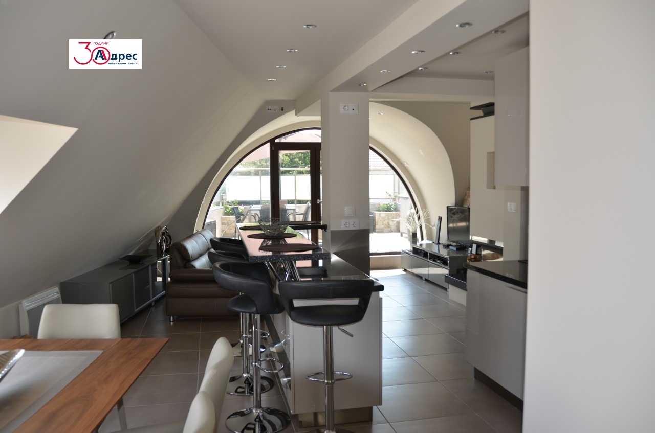 АДРЕС Недвижими Имоти продава луксозен мезонет! Жилището се състои от дневен тракт, три спални, три бани и тоалетни, мокро помещение, две тераси и маза. Отопление-камина, климатици Дайкин и френски радиатори, всички се контролират дистанционно, както и цялото осветление.