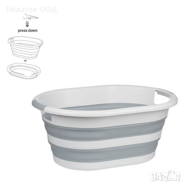 Бяло сив пластмасов леген със сгъваеми дръжки. Натиснете в центъра, за да отворите и след употреба натиснете краищата, за да затворите. Можете да го отворите наполовина и да използвате междинния размер. Дръжките са с неплъзгаща се повърхност за сигурен захват. В затворено състояние се съхранява лесно.