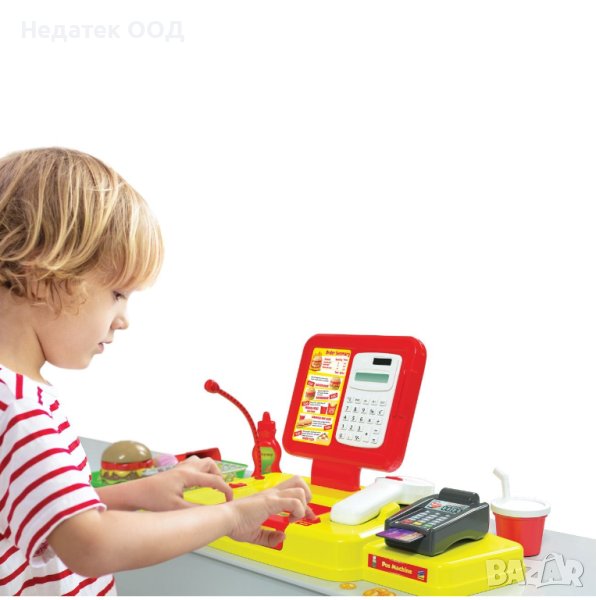 Касов апарат за заведение за бързо хранене. Разполага с микрофон, скенер, POS и стоки. нтерактивните игри помагат за развитието на сетивата, а с малкия компютър децата научават основни математически понятия и укрепват координацията око-ръка. Работи с 2 батерии AAA за скенера (не са включени) и 1 батерия LR130 за компютъра (включени).