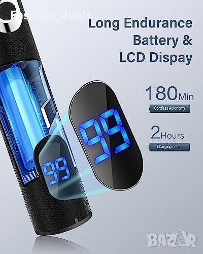 Бързо USB зареждане и LCD дисплей: Литиева батерия, използва се безжично за 180 минути след 2 часа зареждане. USB порт за зареждане, свързва се към USB адаптери, лаптопи, автомобилни зарядни и външни батерии. LCD дисплей показва оставащата мощност.
