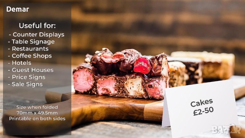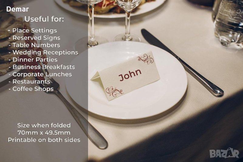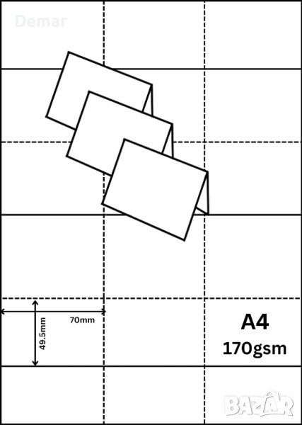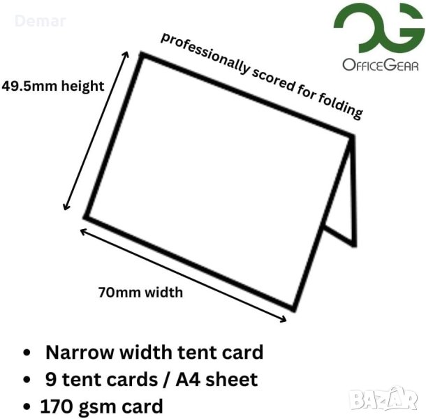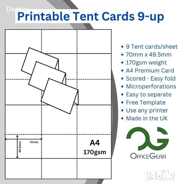 Отпечатайте вашите собствени карти за места за сядане предлага удобно решение с 495 професионални сгъваеми празни триъгълни карти за места/палатки с възможност за персонализиране и печат. Картите са проектирани да се използват с всеки принтер и разполагат с микроперфорирани маркирани карти с размери 49,5 mm x 70 mm (когато са сгънати) за лесно отделяне. Тези карти са многофункционални, подходящи за карти за сядане, настройки за места, карти с имена на конферентни маси, карти за сядане на сватбен прием, табели за цени и общи бележки. Те са изработени от висококачествени 170 g/m2 бели листове A4, с 9 карти на лист и 55 листа в пакет, общо 495 карти, свеждайки до минимум загубата. Освен това, артикулът се доставя с безплатен шаблон за принтер, който да подпомогне процеса на печат. Освен това продуктът е екологичен, тъй като всички опаковки не съдържат пластмаса и могат да се рециклират 100%.