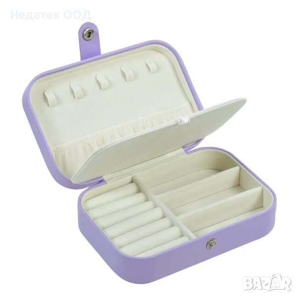 Кутия за бижута за организиране и съхранение на вашите бижута у дома, на пътуване или на почивка. Подплатен с кадифе, има преграда с отвори за шипове и висящи обеци, държачи за пръстени, разделители, закачалки с вериги и джоб. Закопчава се с метално копче.