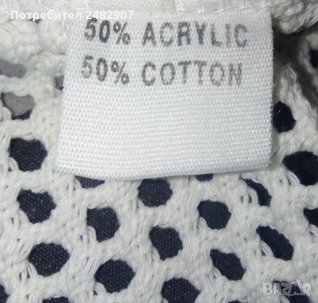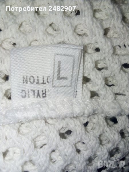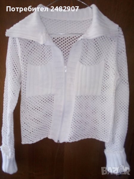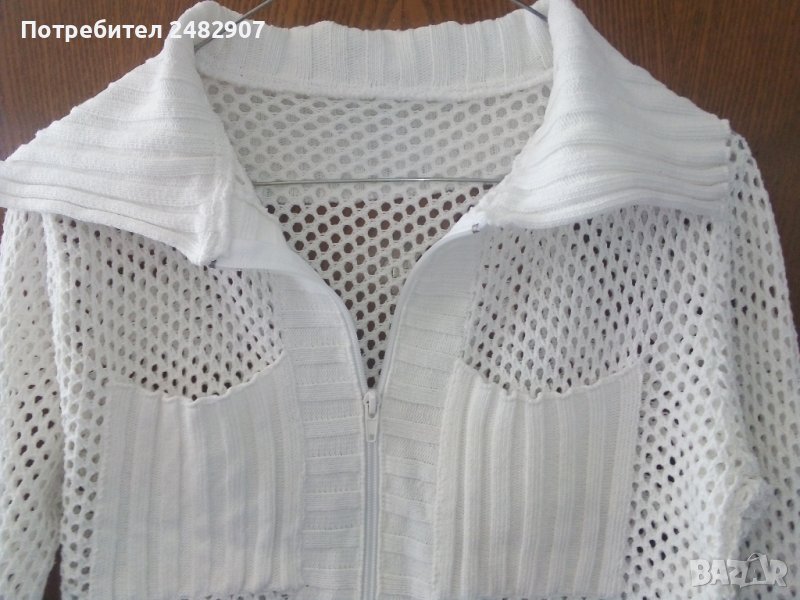 Бяла мрежеста жилетка с два джоба отпред, яка и закопчаване с цип, размер L. Съдържа 50 % акрил и 50 % памук. Ширина в раменете - 40 см, ширина под мишниците - 46 см, дължина от рамото до долу - 47 см, дължина на ръкава от рамото - 63,5 см. Запазена, с нормални следи от износване.