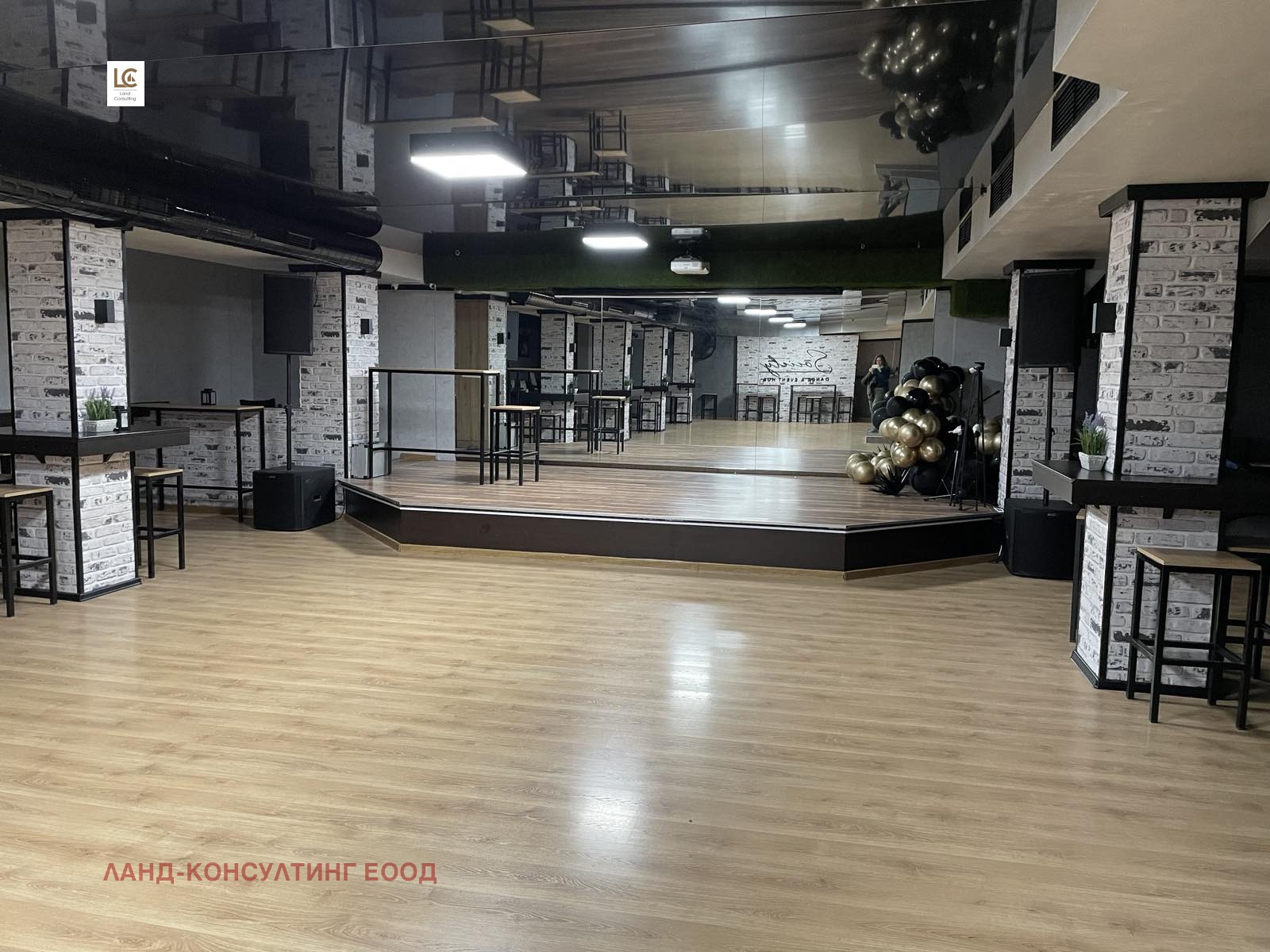Помещението е разположено на едно ниво и представлява голяма зала със сцена,място за бар,два санитарни възела,офис помещение.