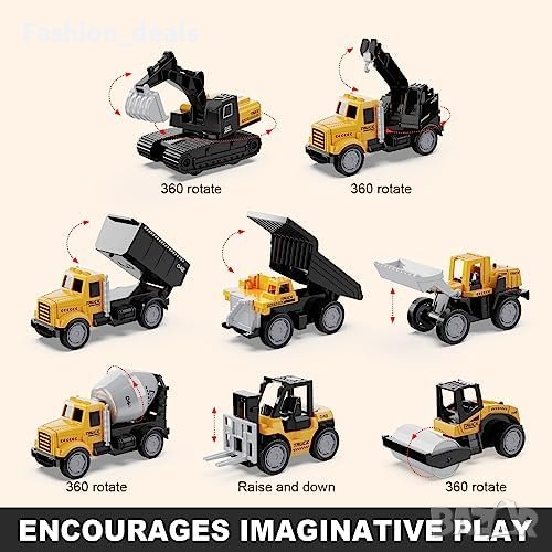 Включва: мотокар, булдозер, валяк, багер, бетоновоз, 2 самосвала, кран